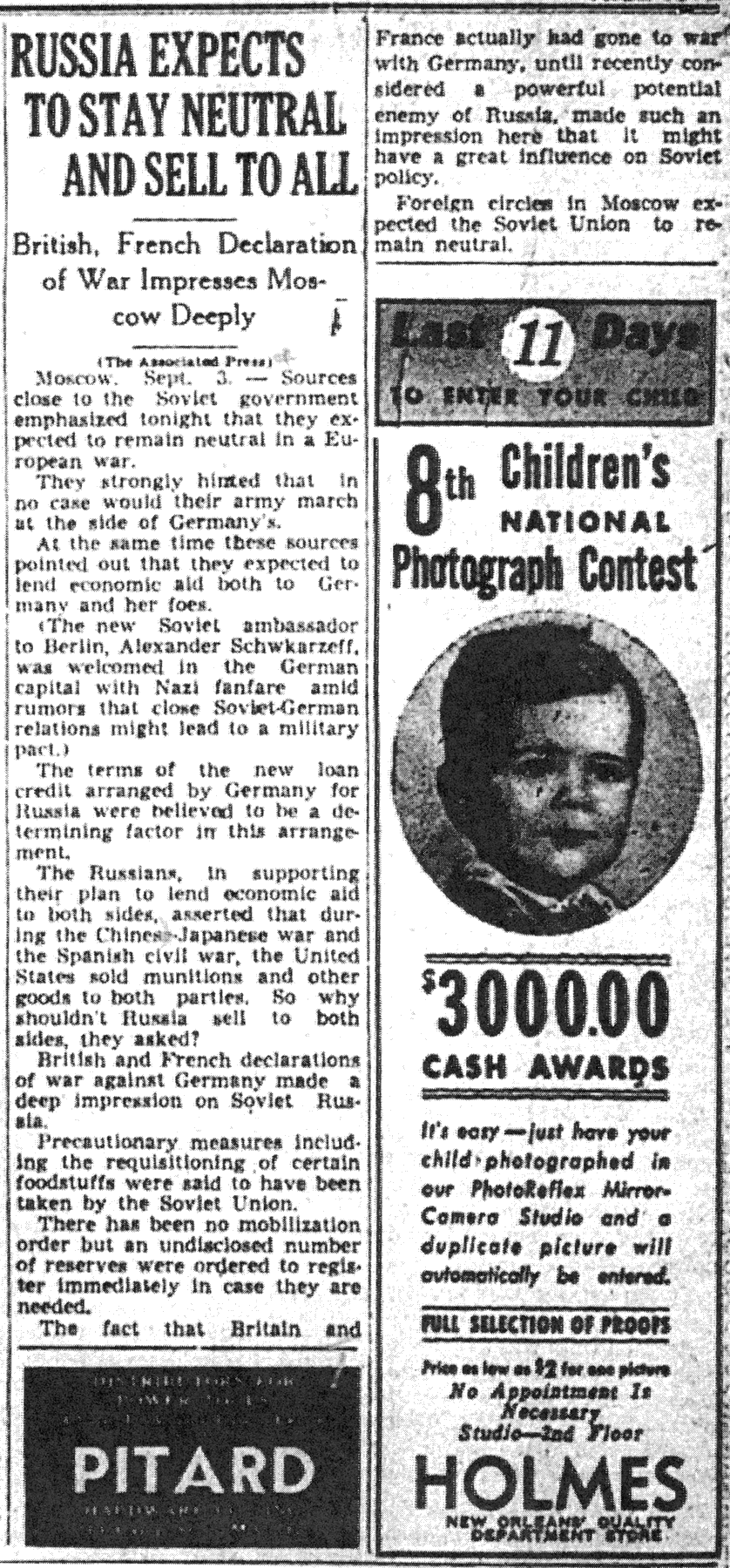 The Times-Picayune , September 4, 1939 - RUSSIA EXPECTS TO STAY NEUTRAL AND SELL TO ALL , British, French Declaration of War Impresses Moscow Deeply, (AP) p. 5