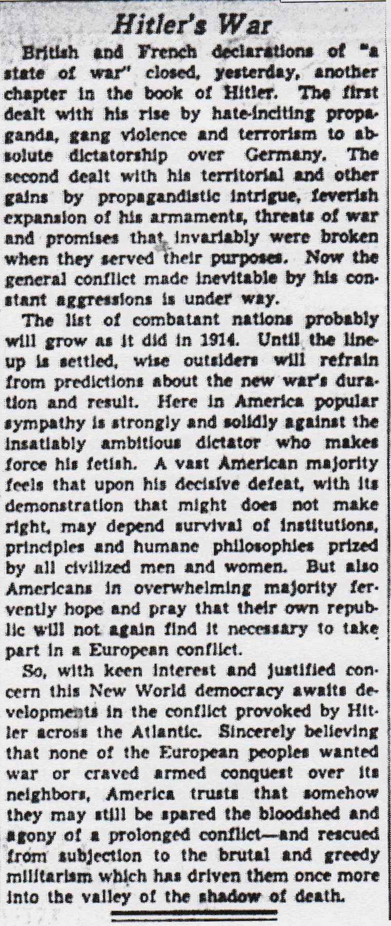The Times-Picayune , September 4, 1939 - Editorial, “Hitler’s War,” p. 6