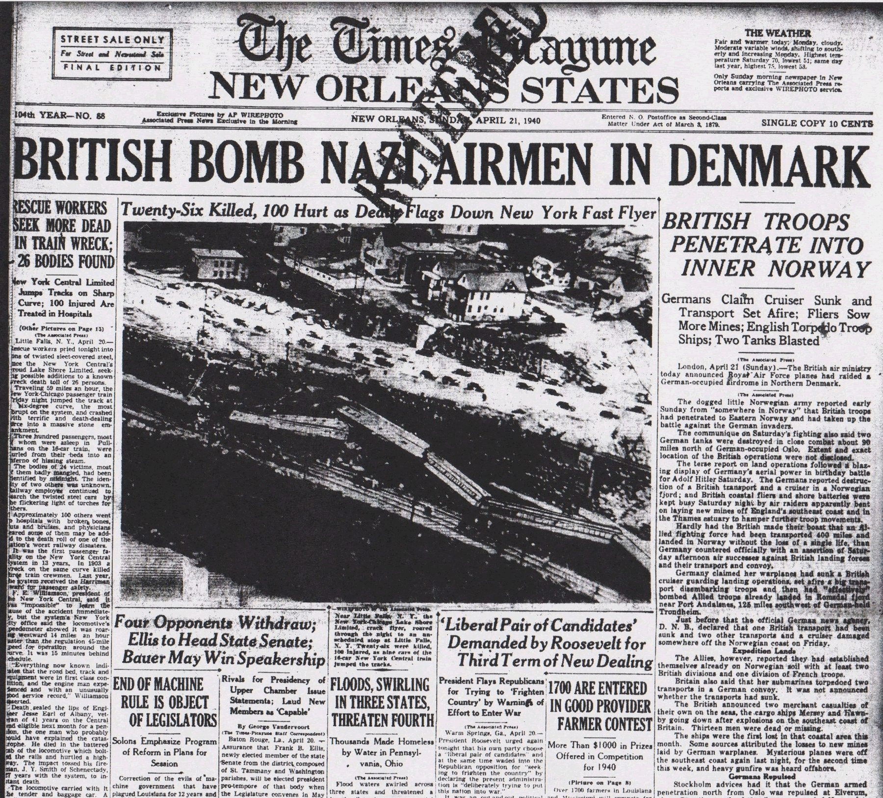 The Times-Picayune, April 21, 1940 - BRITISH BOMB NAZI AIRMEN IN DENMARK, (AP) p. 1 (front page)