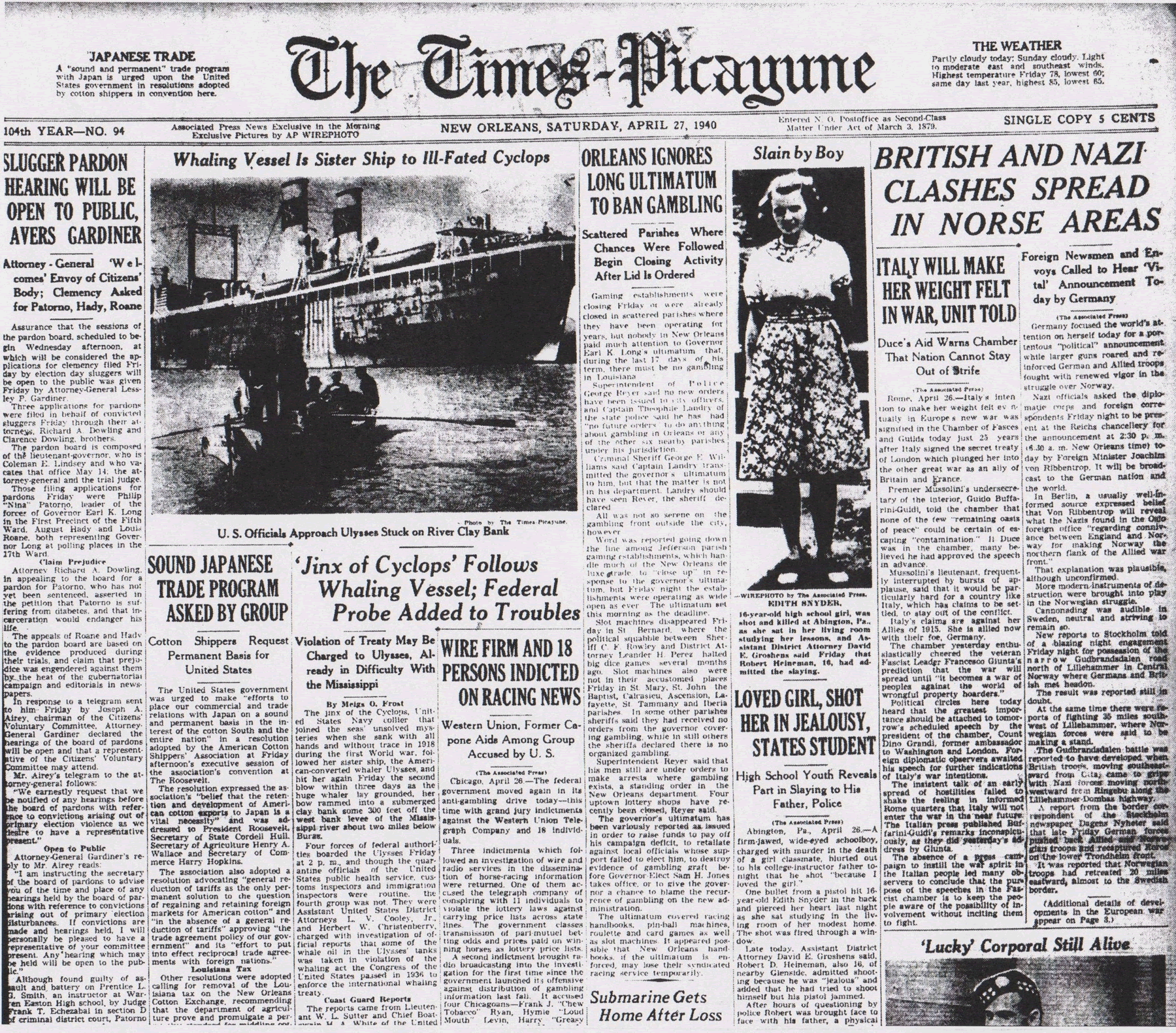 The Times-Picayune, April 27, 1940 - BRITISH AND NAZI CLASHES SPREAD IN NORSE AREAS , (AP) p. 1 (front page)