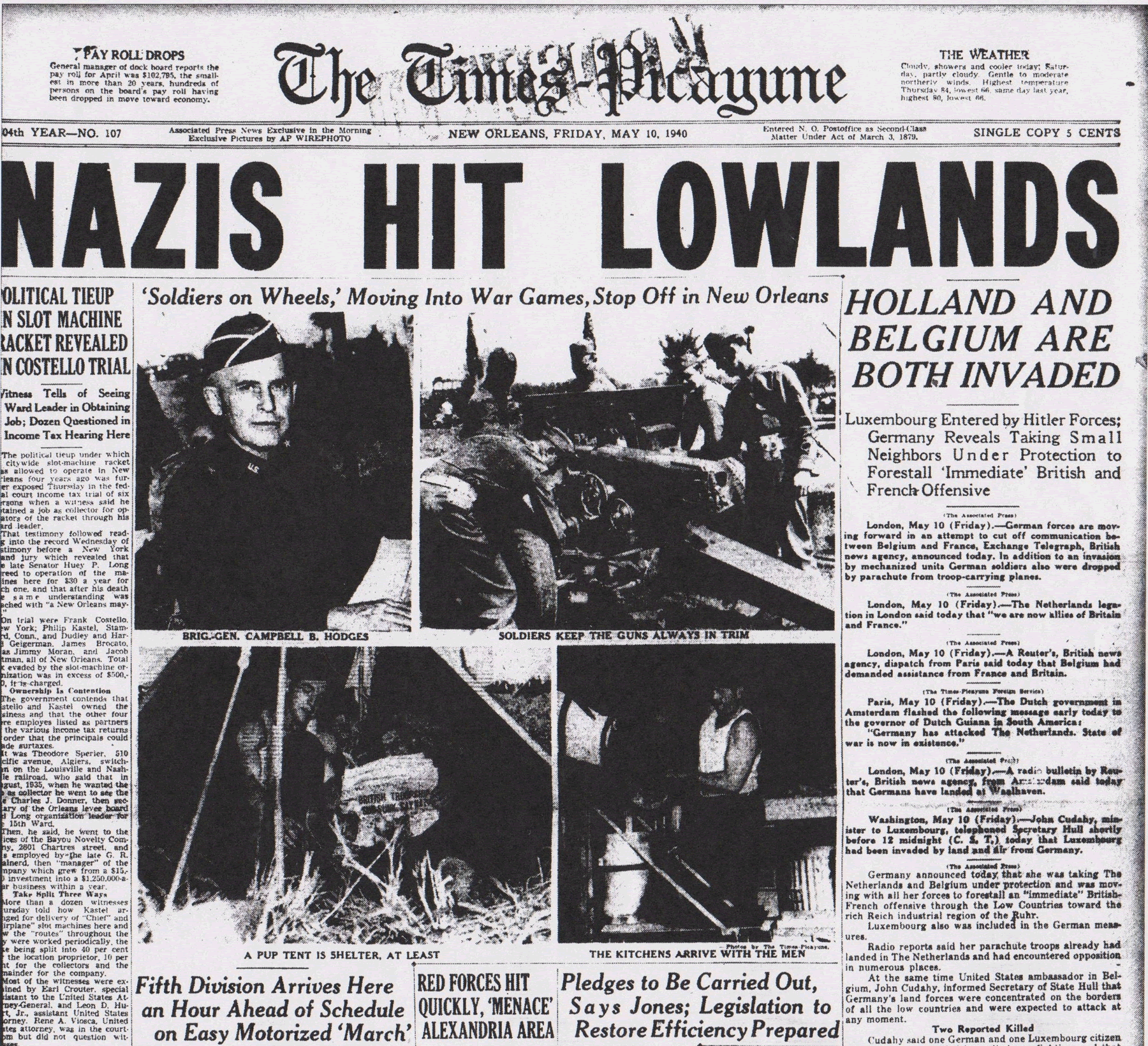 The Times-Picayune , May 10, 1940 - NAZIS HIT LOWLANDS, HOLLAND AND BELGIUM ARE BOTH INVADED, (AP) p. 1 (front page)