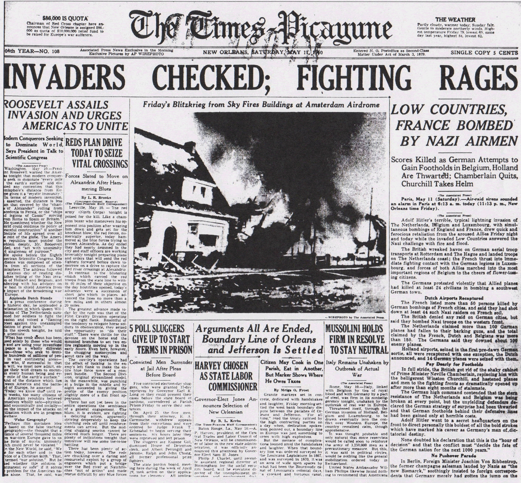 The Times-Picayune , May 11, 1940 - INVADERS CHECKED; FIGHTING RAGES, LOW COUNTRIES, FRANCE BOMBED BY NAZI AIRMEN, (AP) p. 1 (front page)