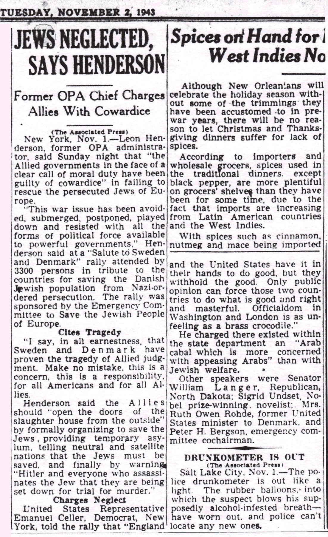 The Times-Picayune, November 2, 1943 - JEWS NEGLECTED, SAYS HENDERSON, Former OPA Chief Charges Allies With Cowardice, (AP) p. 6