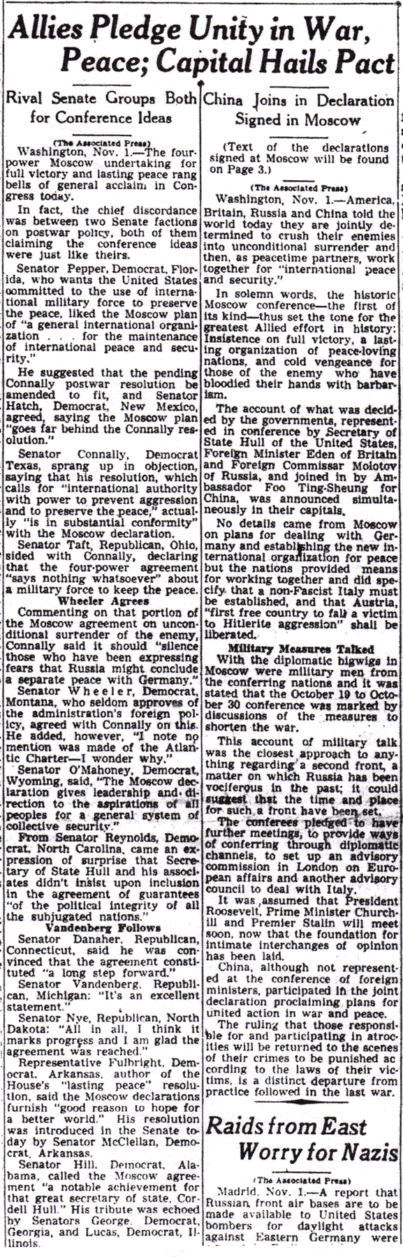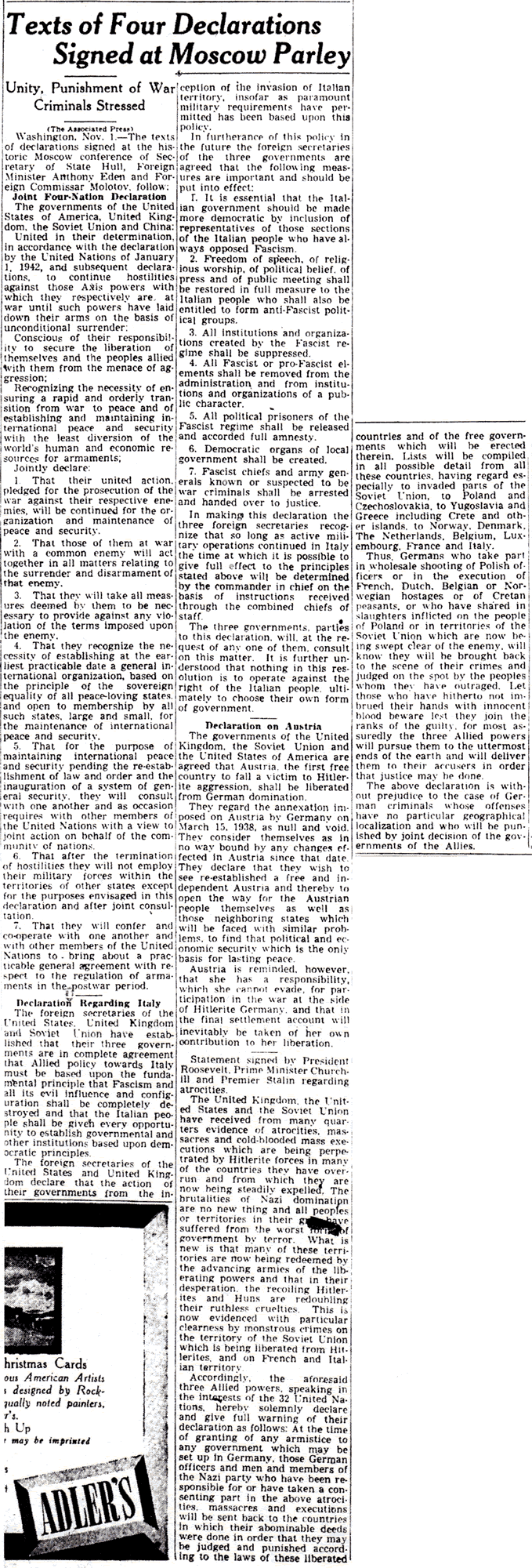 The Times-Picayune, November 2, 1943 - Texts of Four Declarations Signed at Moscow Parley, Unity, Punishment of War Criminals Stressed, (AP) p. 3
