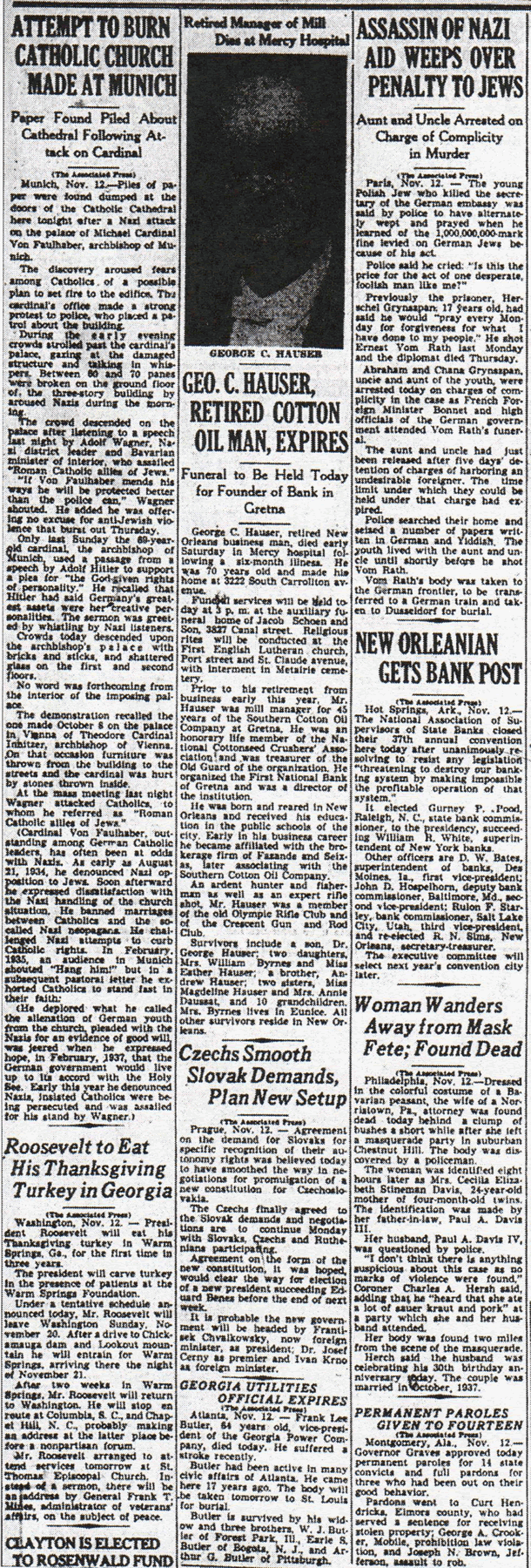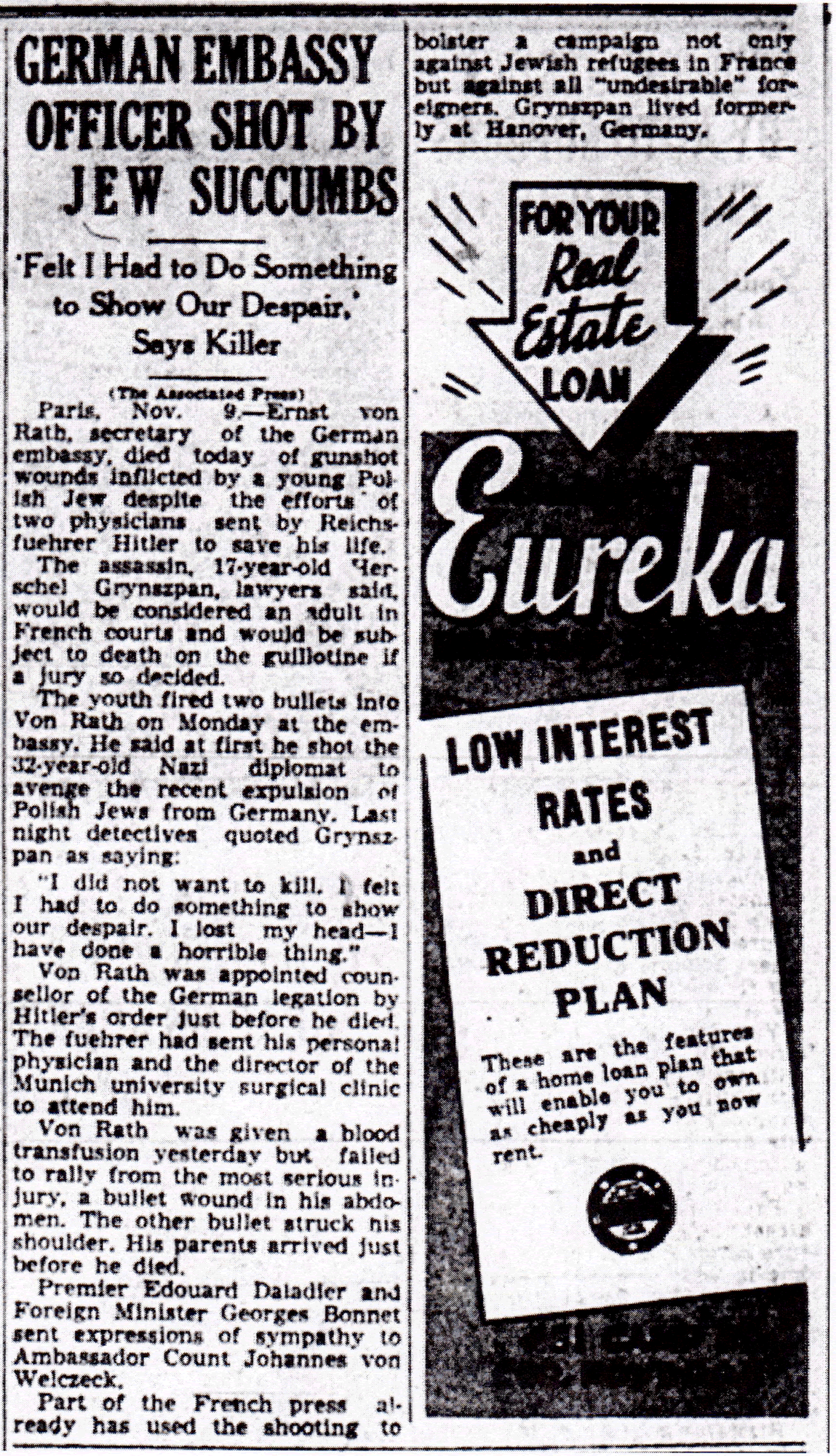 The Times-Picayune, November 10, 1938 - GERMAN EMBASSY OFFICER SHOT BY JEW SUCCUMBS, ‘Felt I Had to Do Something to Show Our Despair,’ Says Killer, (AP) p. 6