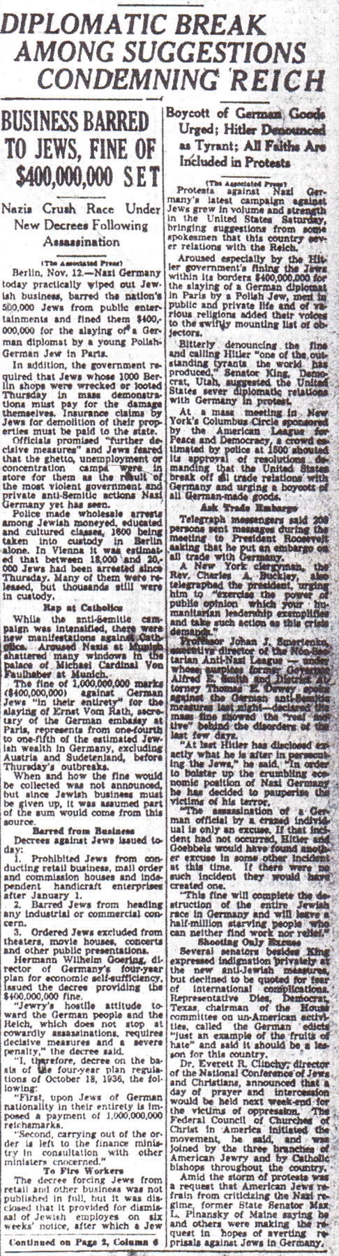 The Times-Picayune, November 13, 1938 - U. S. AROUSED OVER NAZIS’ CRUSHING OF JEWS, Diplomatic Break Among Suggestions Condemning Reich, (AP) p. 1 (column)