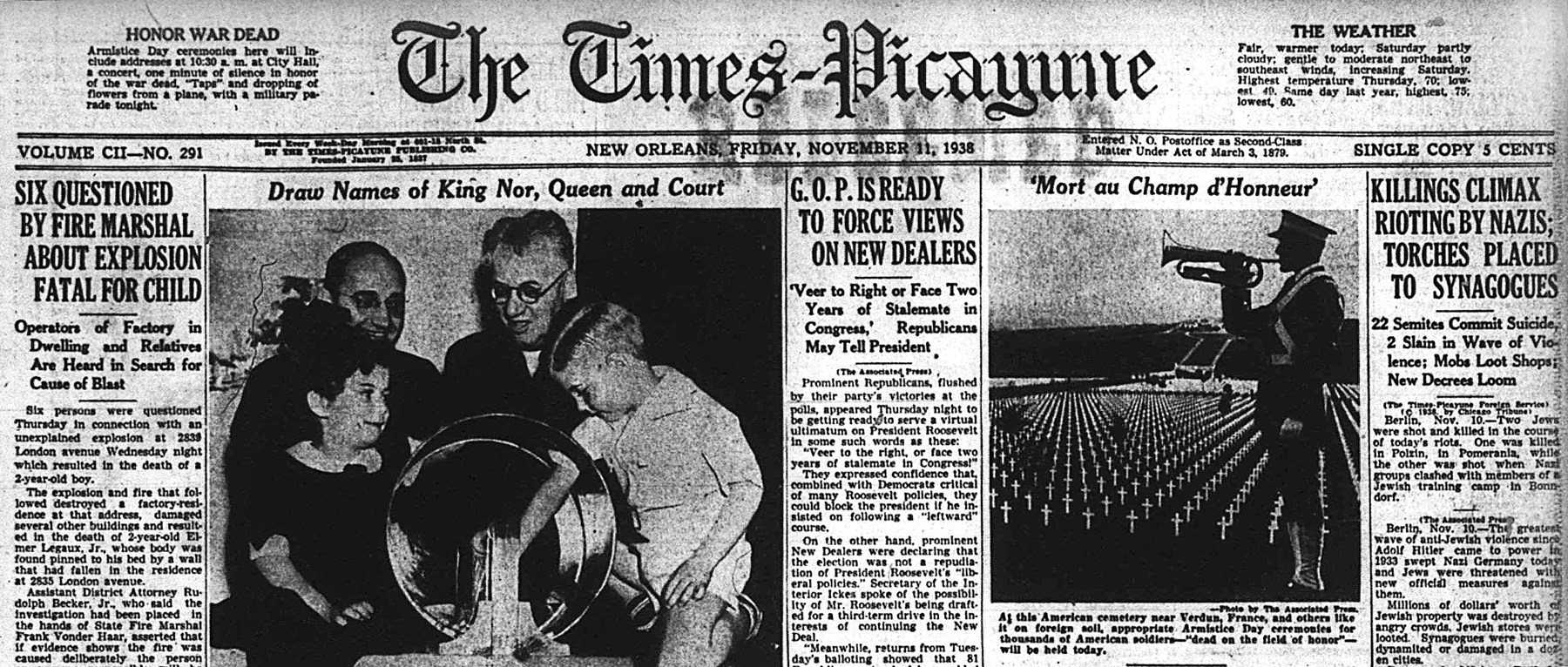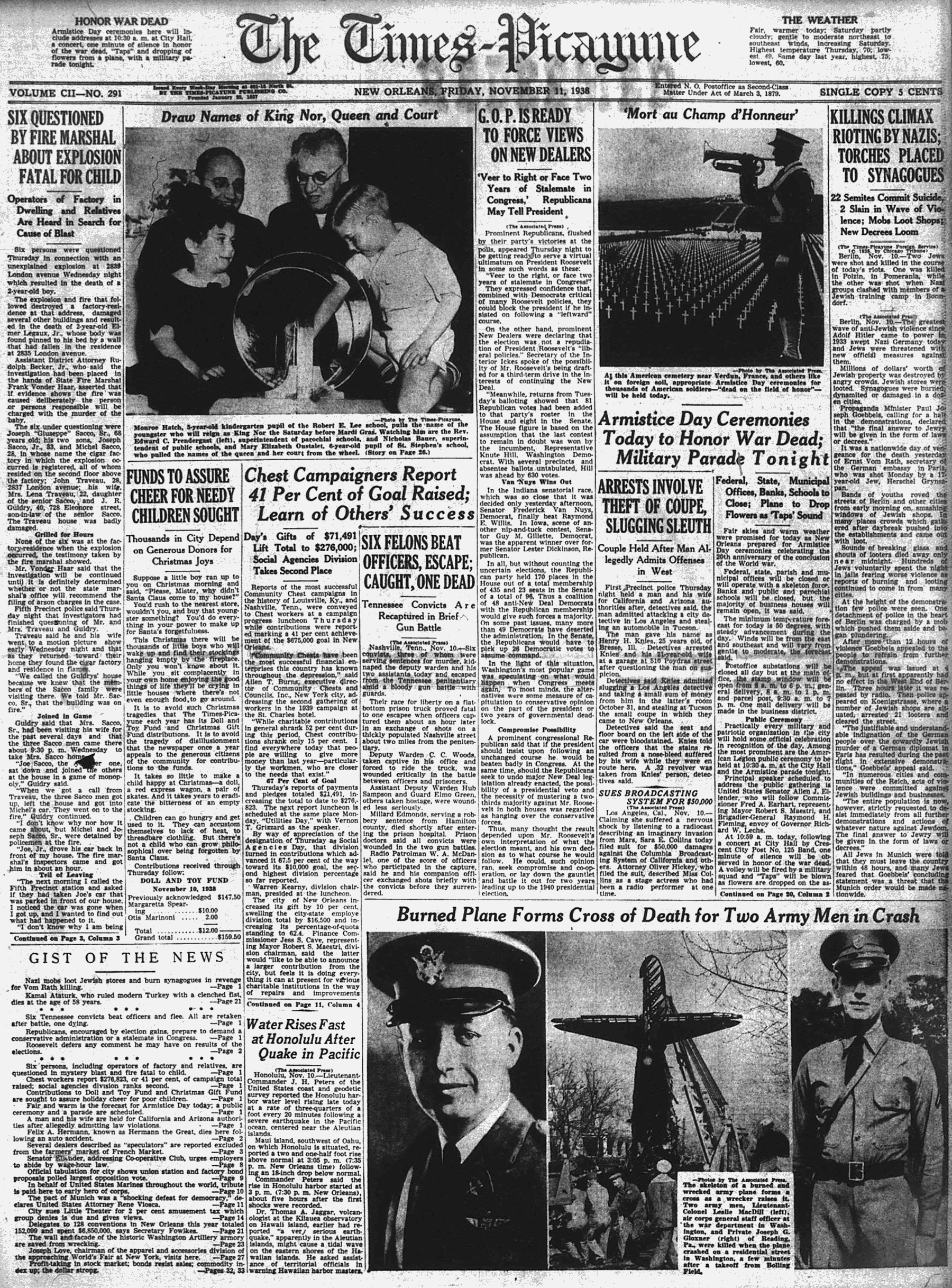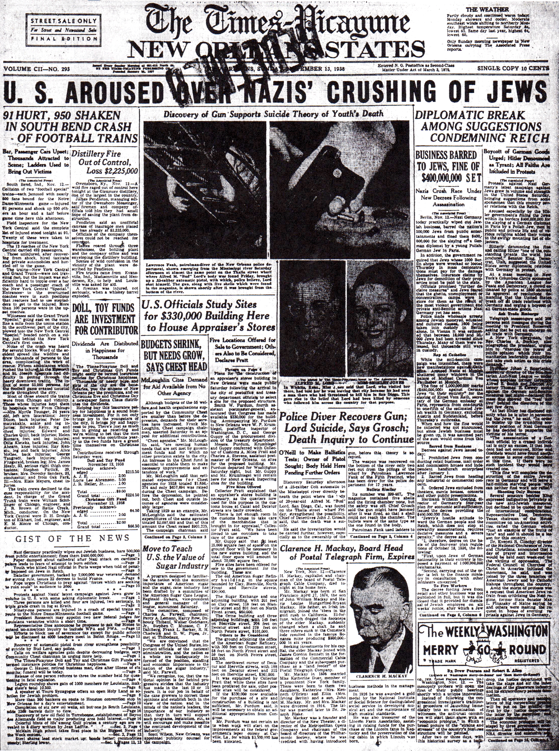 The Times-Picayune, November 11, 1938 - KILLINGS CLIMAX RIOTING BY NAZIS, TORCHES PLACED TO SYNAGOGUES, 22 Semites Commit Suicide, (The Times-Picayune Foreign Service) p. 1