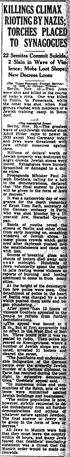 The Times-Picayune, November 11, 1938 - KILLINGS CLIMAX RIOTING BY NAZIS, TORCHES PLACED TO SYNAGOGUES, 22 Semites Commit Suicide, (The Times-Picayune Foreign Service) p. 1 (column)