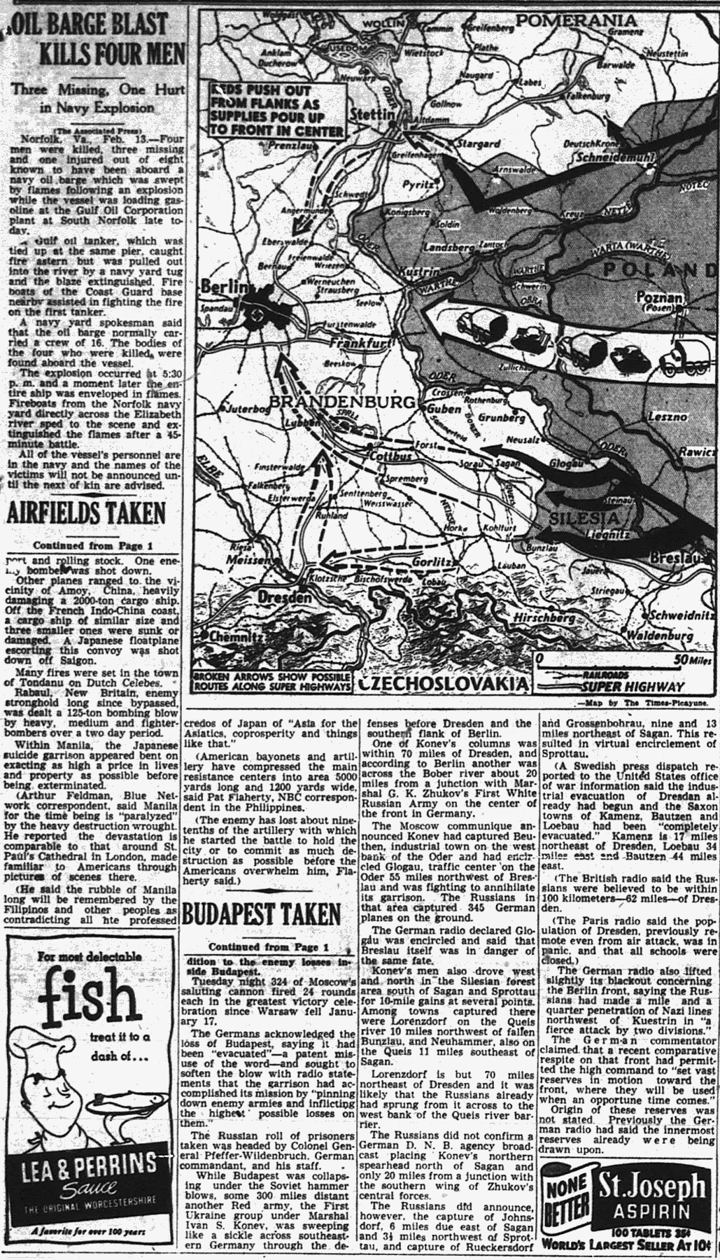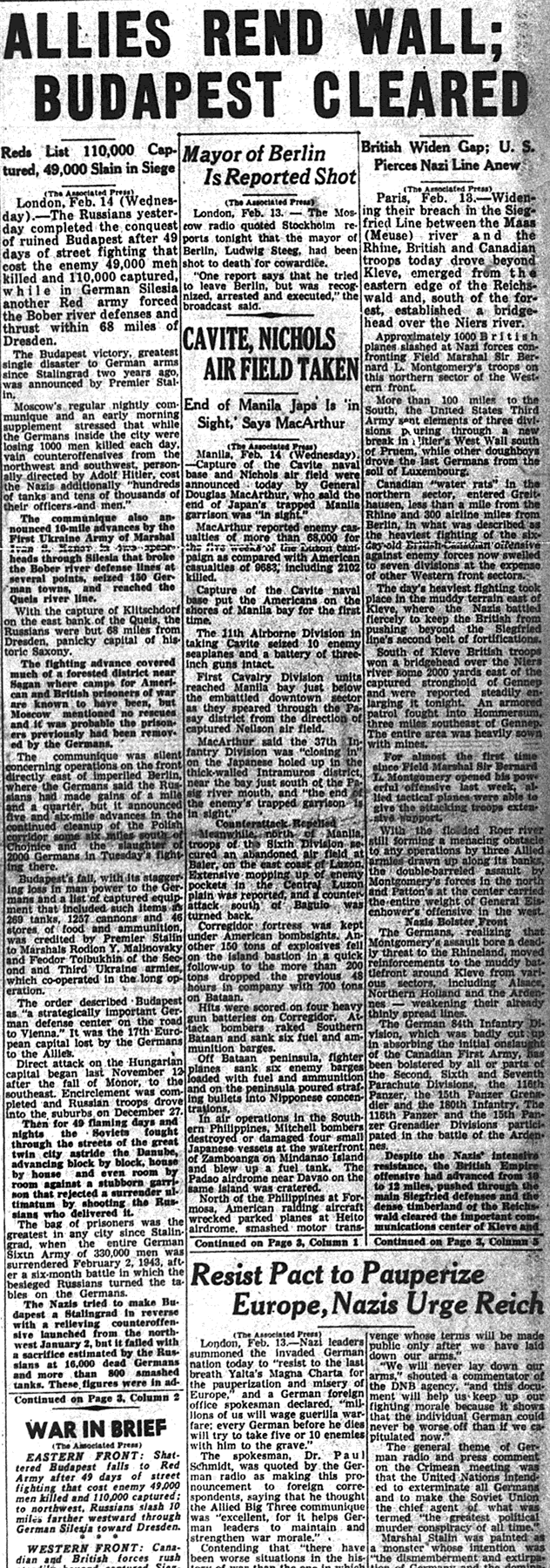 The Times-Picayune , February 14, 1945 - ALLIES REND WALL BUDAPEST CLEARED, Reds List 110,000 Captured, 49,000 Slain in Siege, (AP) p. 1 (front page)