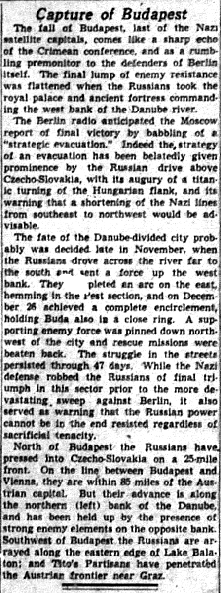 The Times-Picayune , February 14, 1945 - Editorial, Capture of Budapest , p. 8