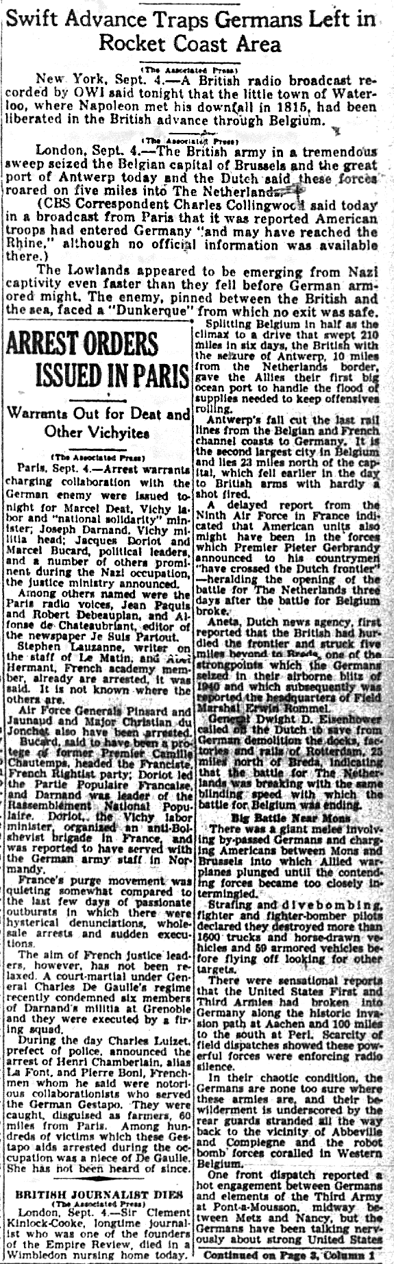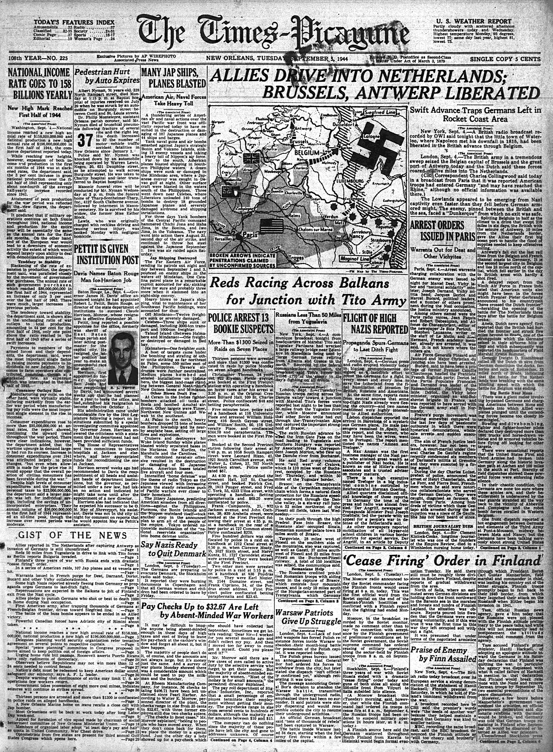 The Times-Picayune , September 5, 1944 - ALLIES DRIVE INTO NETHERLANDS; BRUSSELS, ANTWERP LIBERATED, Swift Advances Traps Germans Left in Rocket Coast Area, (AP) p. 1 (front page)