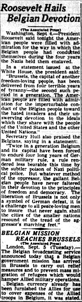 The Times-Picayune, September 5, 1944 - Roosevelt Hails Belgian Devotion , (AP) p. 3