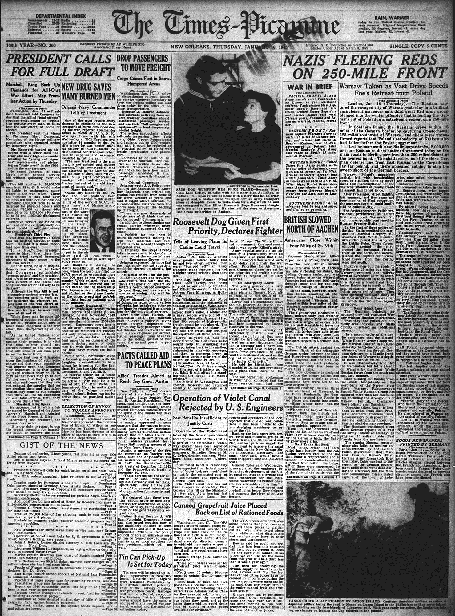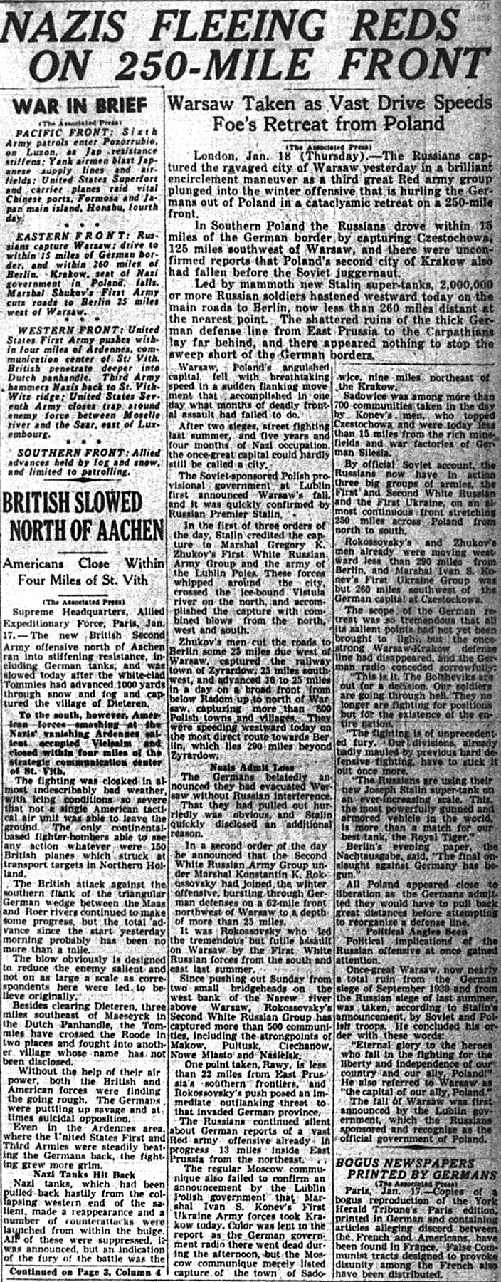 The Times-Picayune, January 18, 1945 - NAZIS FLEEING REDS ON 250 MILE FRONT, Warsaw Taken in Vast Drive, Speeds Foe’s Retreat From Poland, (AP) p. 1 (front page)