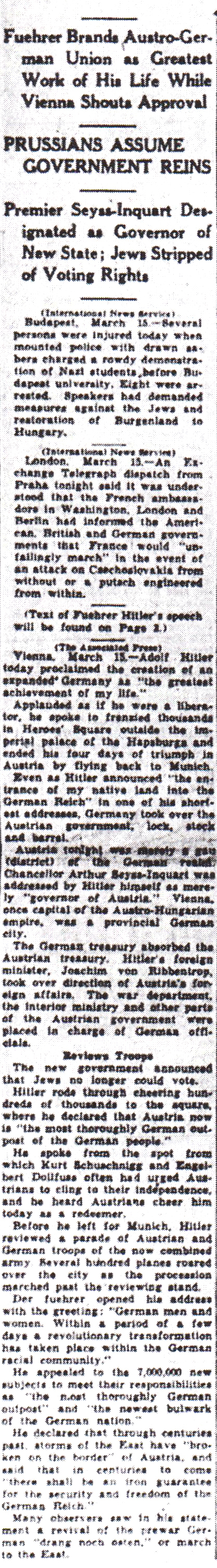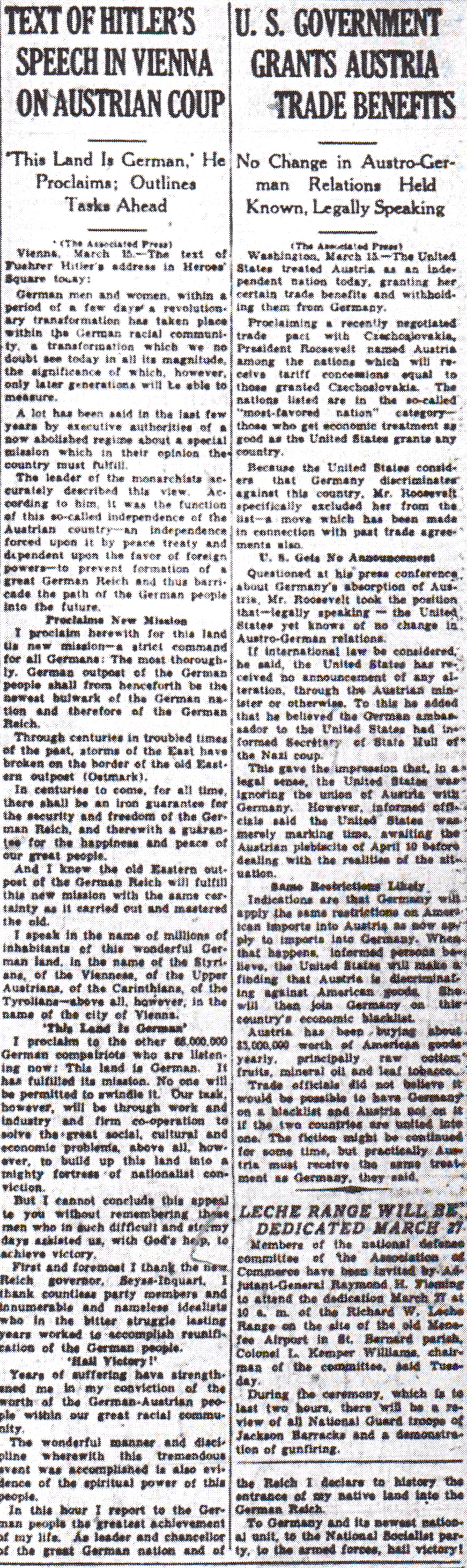 The Times-Picayune, March 16, 1938 - Text of Hitler’s Speech in Vienna on Austrian Coup, ‘This Land is German,’ He Proclaims, Outlines Tasks Ahead, (AP) p. 3