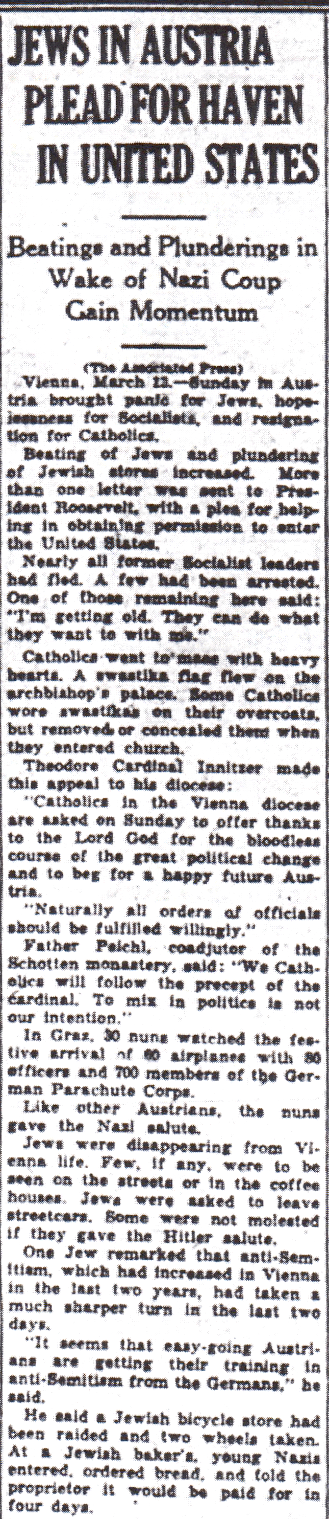 The Times-Picayune, March 14, 1938 - Jews in Austria Plead for Haven in United States, Beatings and Plunderings in Wake of Nazi Coup Gain Momentum, (AP) p. 2