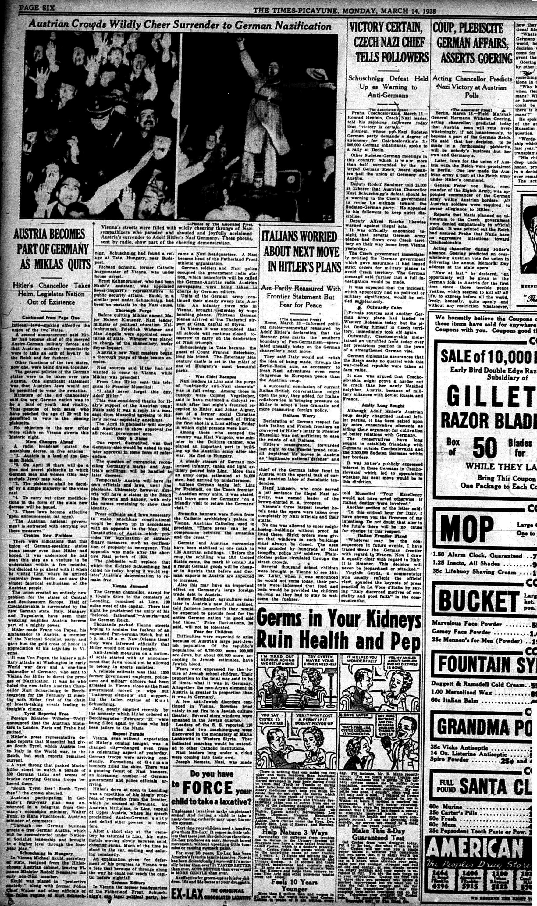 The Times-Picayune, March 14, 1938 - Austria Becomes Part of Germany as Miklas Quits, Hitler’s Chancellor Takes Reins, Legislates Nation Out of Existence, (AP) p. 6