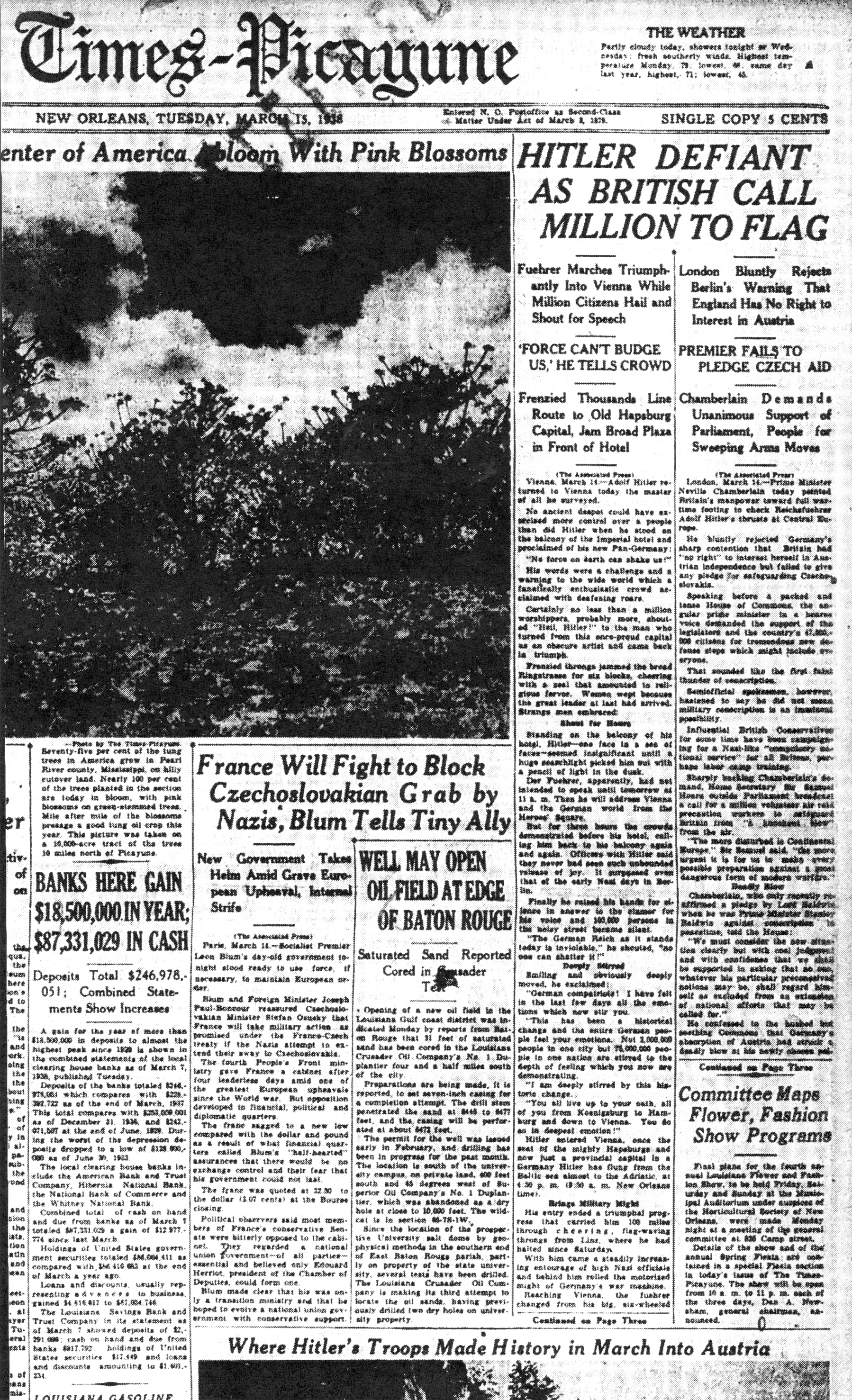 The Times-Picayune, March 15, 1938 - Hitler Defiant as British Call Million to Flag, Fuehrer Marches Triumphantly Into Vienna While Million Citizens Hail and Shout for Speech, (AP) p. 1 (front page)