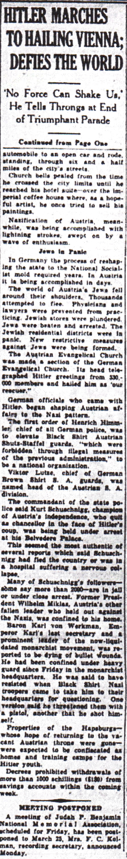The Times-Picayune, March 15, 1938 - Hitler Marches to Hailing Vienna; Defies the World, ‘No Force Can Shake Us,’ He Tells Throngs at End of Triumphant Parade, p. 3