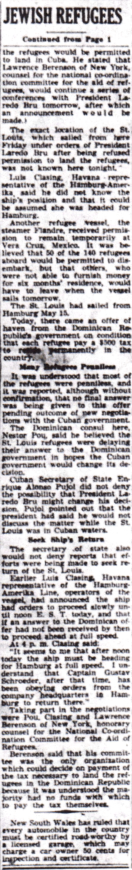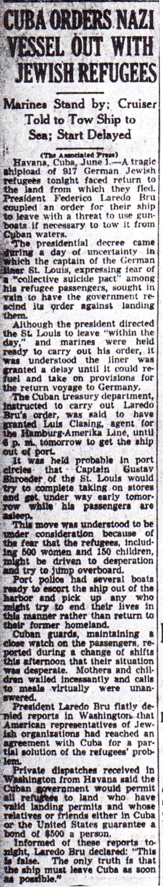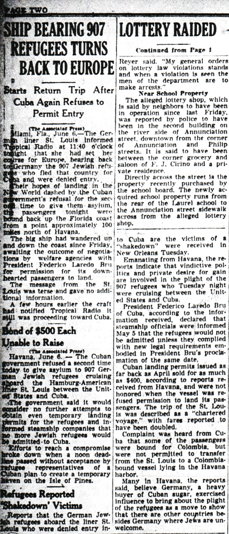 The Times-Picayune, June 3, 1939- SHIP SAILS FROM HAVANA WITH 907 JEWISH REFUGEES, Germany-Bound Passengers, to Prevent Mass Suicides, Told They May be Landed in New York, (AP) p. 1