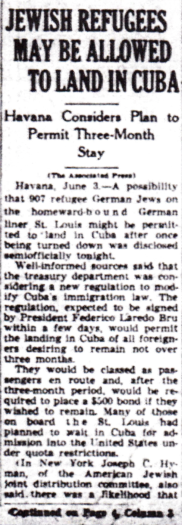 The Times-Picayune, June 4, 1939 - JEWISH REFUGEES MAY BE ALLOWED TO LAND IN CUBA, Havana Considers Plan to Permit Three-Month Stay, (AP), p. 1