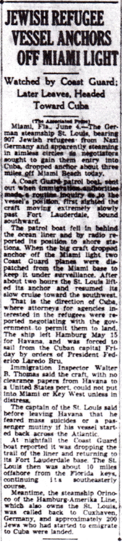 The Times-Picayune, June 5, 1939 -JEWISH REFUGEE VESSEL ANCHORS OFF MIAMI LIGHT, Watched by Coast Guard, Later Leaves, Headed Toward Cuba,(AP) p. 1