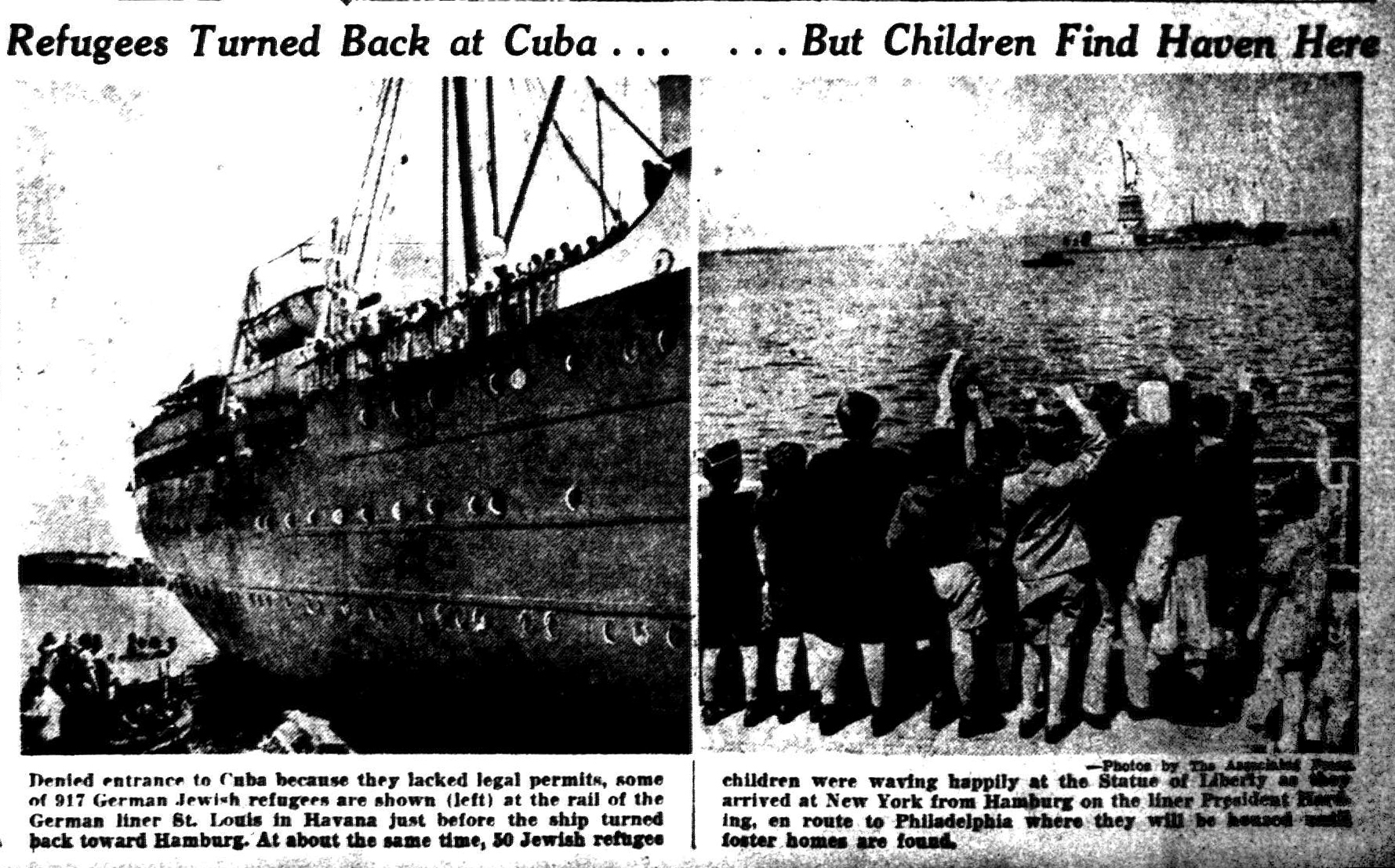 The Times-Picayune, June 5, 1939 - Refugees Turned Back at Cuba...But Children Find Haven Here, (AP) p. 1