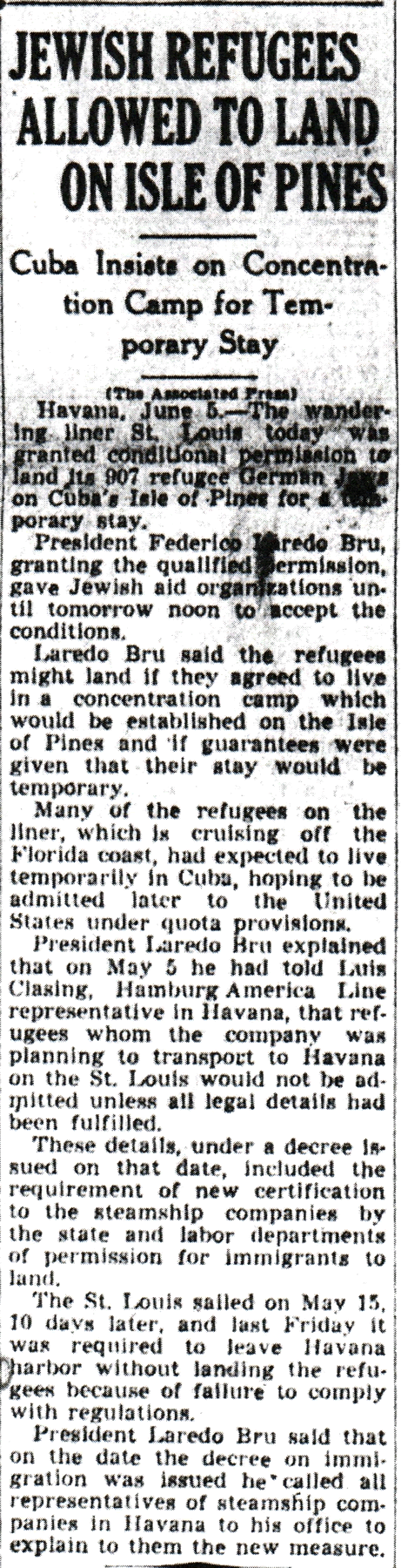 The Times-Picayune, June 6, 1939 - JEWISH REFUGEES ALLOWED TO LAND ON ISLE OF PINES, Cuba Insists on Concentration Camp for Temporary Stay, (AP) p. 1