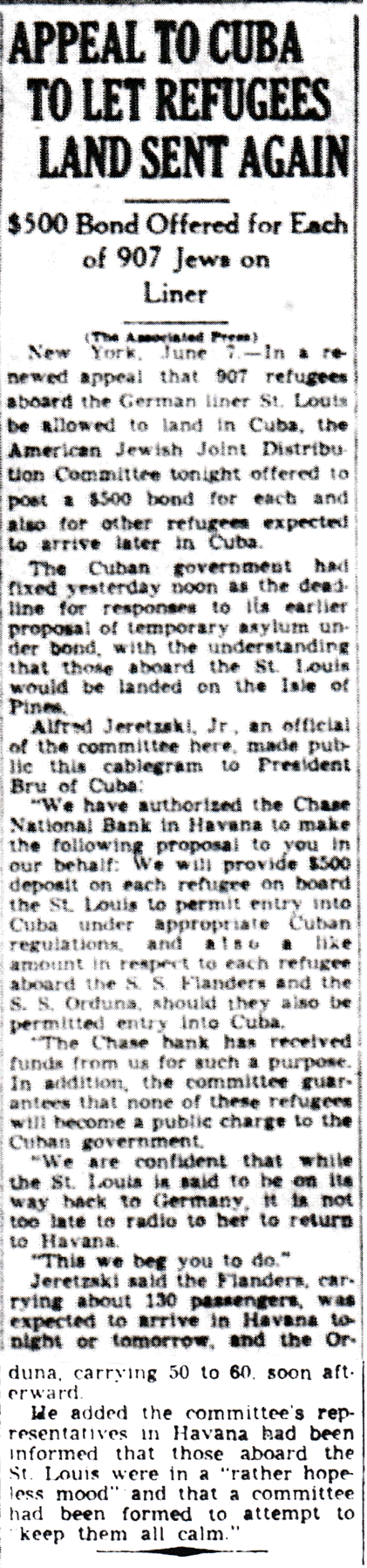The Times-Picayune, June 8, 1939 - APPEAL TO CUBA TO LET REFUGEES LAND SENT AGAIN, $500 Bond Offered for Each of 907 Jews on Liner, (AP) p. 6