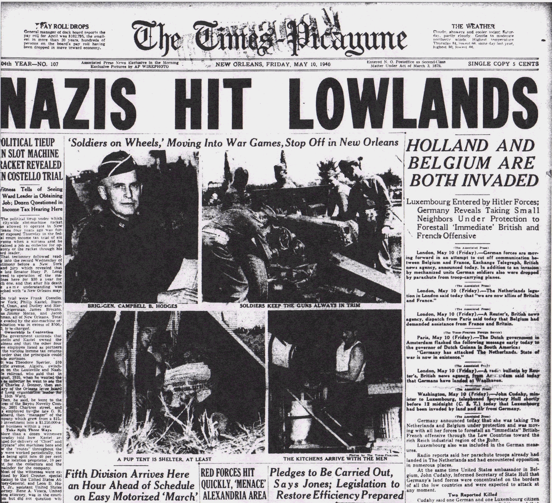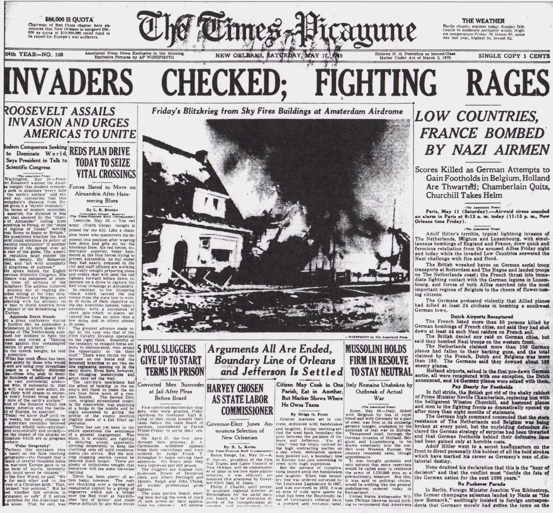 The Times-Picayune provided detailed coverage of the German assault on Western Europe. For more Times-Picayune articles on the Blitzkrieg in the West, click on the Chronology of Destruction.
