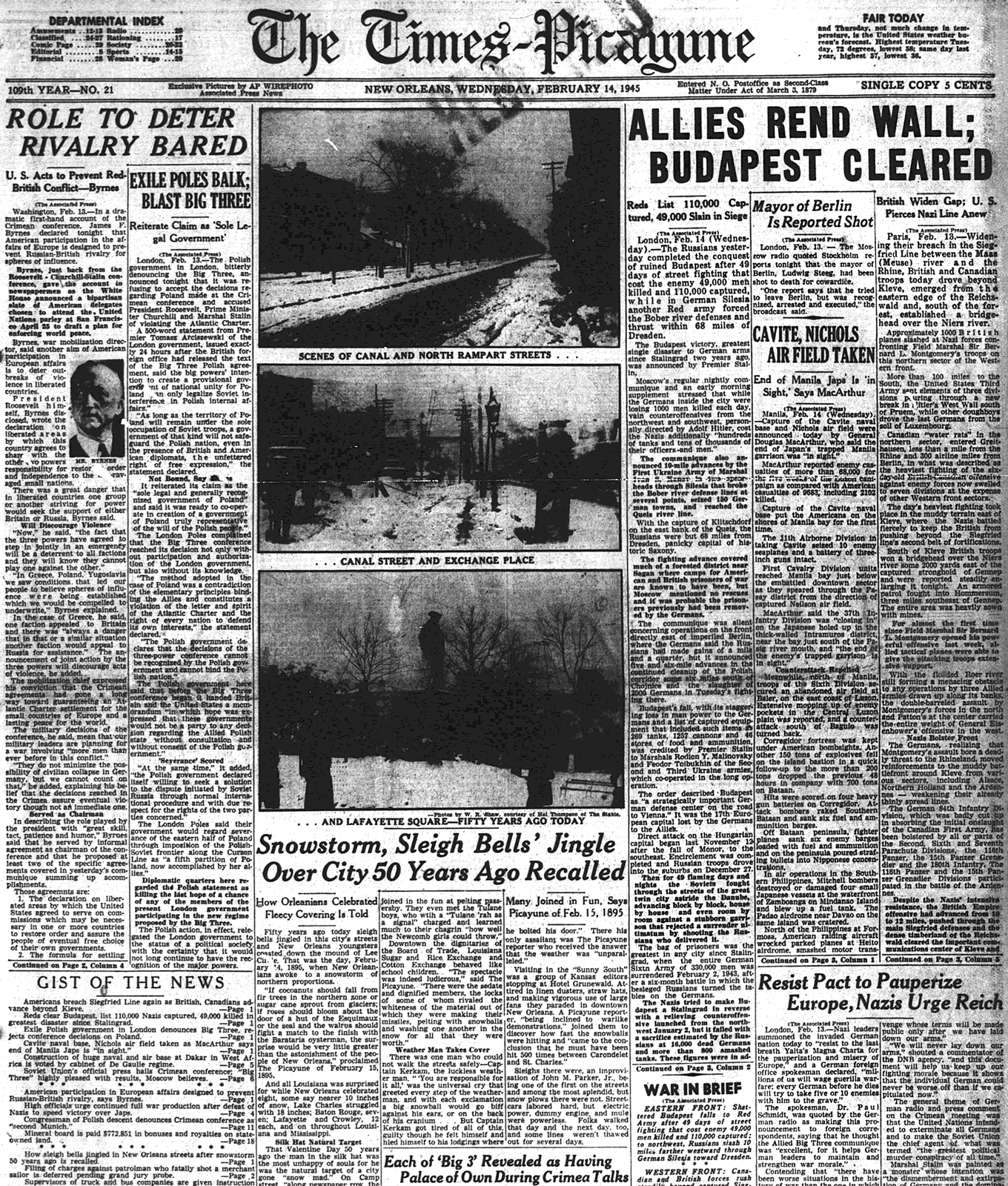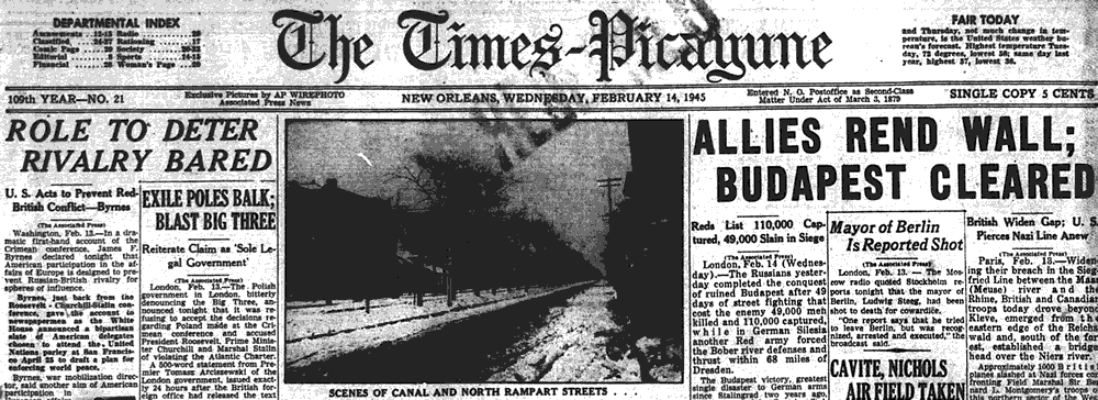 In a front page article on February 14, 1945, The Times-Picayune described the intense fighting during the siege of Budapest and the German capitulation to the Russians on February 13, 1945.