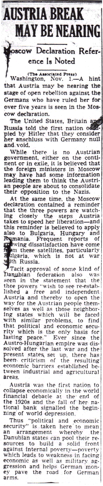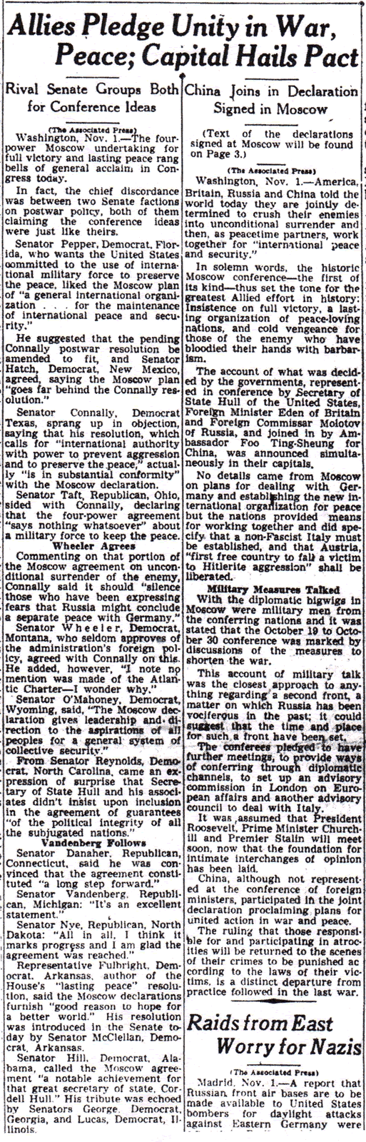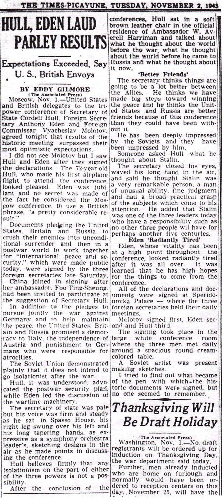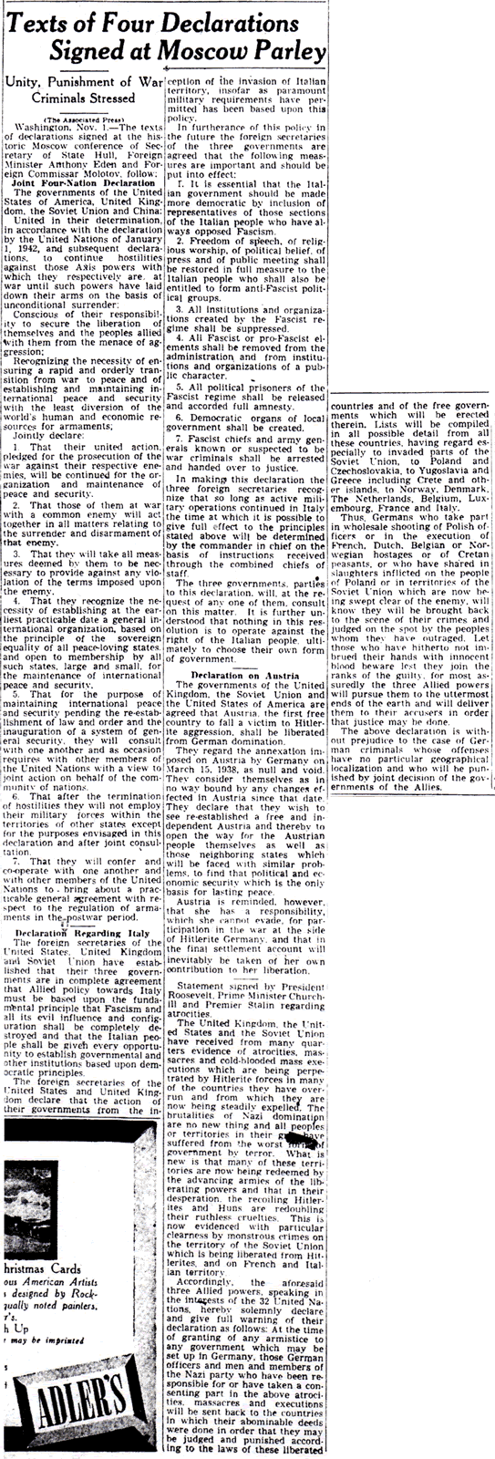 The result of this conference was The Moscow Declaration, presented to the world on November 1, 1943 and summarized in The Times-Picayune the following day. The Moscow Declaration actually consisted of four declarations, one being The Declaration on German Atrocities. This declaration, measuring no more than a paragraph, was remarkable for what it did not say: not a single word was devoted to the tragic fate of the Jews.