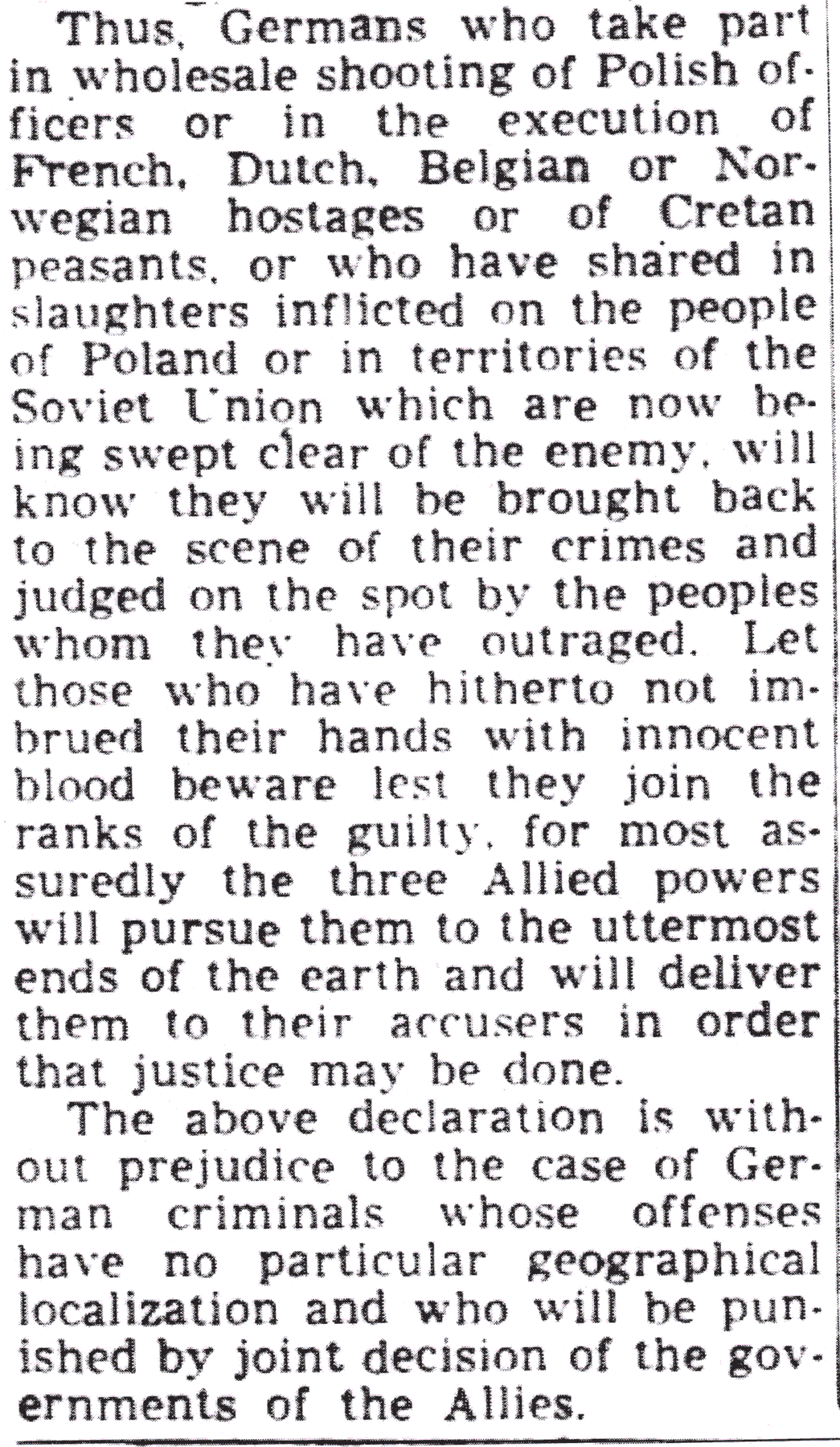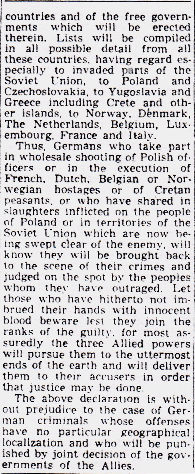 The Declaration on German Atrocities made it clear to “the Germans” that they would be made to pay for their crimes, “for most assuredly the three Allied Powers will pursue them to the uttermost ends of the earth and will deliver them to their accusers in order that justice may be done.” That turned out to be wishful thinking. Not a few of the German war criminals would be employed by the Americans against the Soviets in the post-war era.