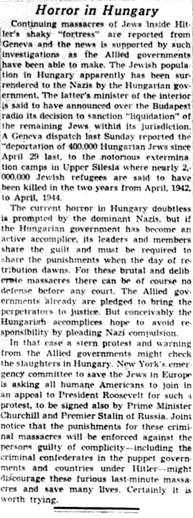 On July 8, 1944, The Times-Picayune ran an editorial about the Hungarian transports. It referred to “the notorious extermination camps in Upper Silesia” and called for the punishment of “the Hungarian accomplices.” Nothing was said about the Allies bombing the railroad tracks or attempting rescue efforts. But the editorialist agreed with those who urged the Allies to make “a stern protest and warning” to the perpetrators: “Certainly it is worthy trying.”