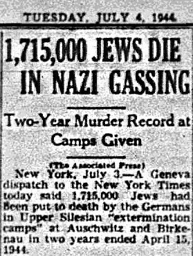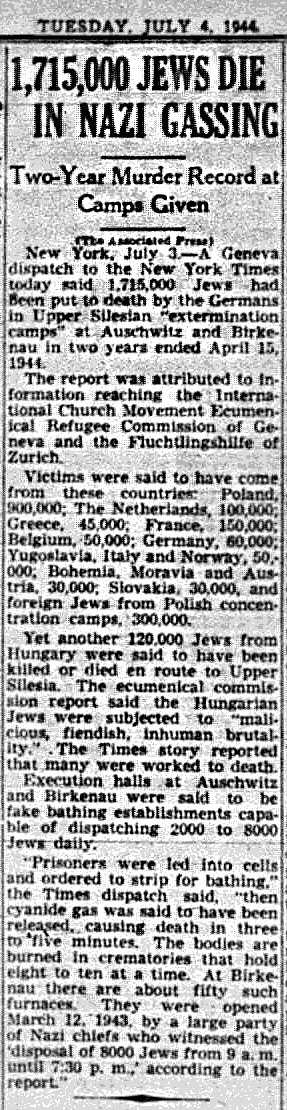 “Yet another 120,000 Jews from Hungary were said to have been killed or died en route to Upper Silesia.” The Hungarian Jews were subjected to “malicious, fiendish, in humane brutality.” The method of extermination was explained: the “Execution halls” were “fake bathing establishments capable of dispatching two thousand to eight thousand Jews daily.” The victims “were led into cells and ordered to strip for bathing, then cyanide gas was said to have been released, causing death in three to five minutes.”