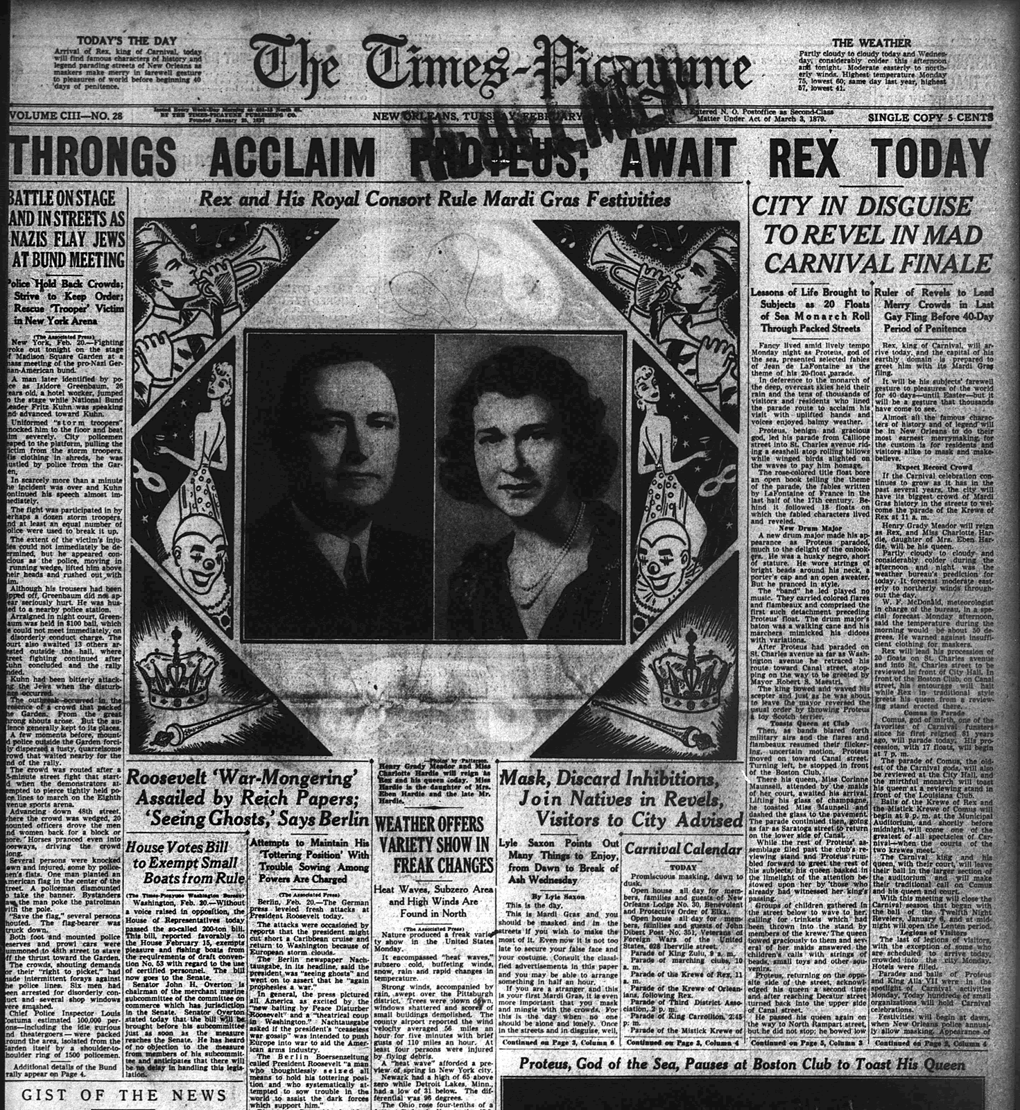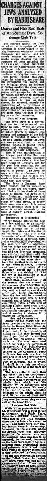 In New Orleans, on the day after Hitler’s speech, Rabbi Nathaniel Share of Congregation Gates of Prayer addressed the Exchange Club at Maylie’s Restaurant. On article about his talk appeared on page 8. He explained that anti-Semitism was “a convenient tool for the forces of reaction,” and that “When anyone attacks the Jew as a Jew and not as an individual, he is merely shooting his arrows through him at the real target, the rights and liberties of individuals. The Jews is the barometer of civilization because he is the hostage of fortune…” He dismissed the widely held belief that Jews were linked to communism.
