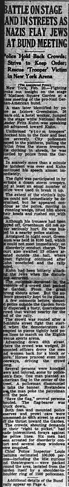 The American Nazi Party (the Bund) held a rally at Madison Square Garden on February 20, 1939. The reporter Dorothy Thompson, a dogged advocate of Jewish refugees, shouted “Bunk” at the speaker and a near-riot ensured.
