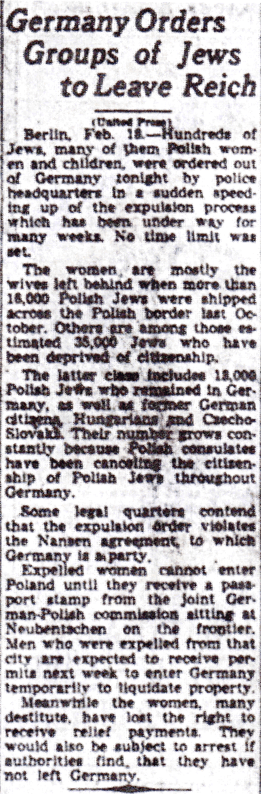 On February 19, 1939, The Times-Picayune published an article describing a second expulsion of Polish Jews from Germany that included Jewish women and children whose husbands and fathers (1,600) were expelled in October 1938 (leading to Kristallnacht) They were ordered out of Germany that very night. Many of the women were “destitute.” The number of refugees was uncertain “because Polish consulates have been cancelling the citizenship of Polish Jews throughout Germany.”