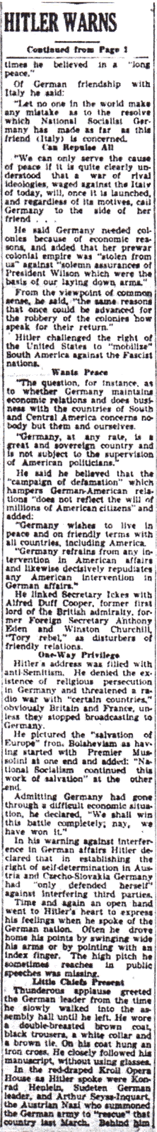 The article on Hitler’s speech was placed at the top of page 1. Next to it was an article about the effect of the speech on the stock market: “Stocks move up on mild tone of Hitler’s speech.”