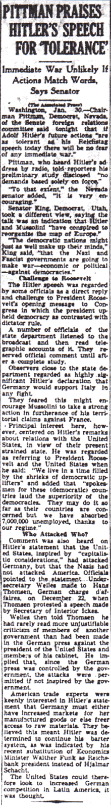 Pittman, a Democratic senator from Nevada, was chairman of the Senate Foreign Relations Committee. His impression of the speech was positive: if Hitler’s actions were “as tolerant as his Reichstag speech today there will be no fear of any immediate war.”