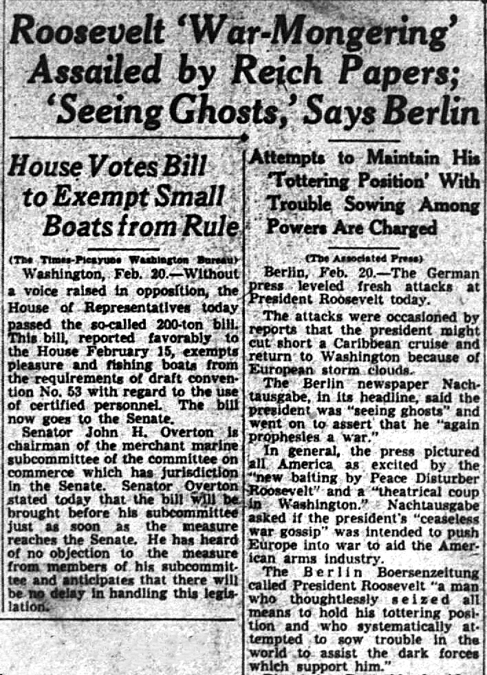 On February 21, 1939, an article recounted the abuse heaped on President Roosevelt by Nazi newspapers. He was labelled “a war monger” who was “seeing ghosts.”