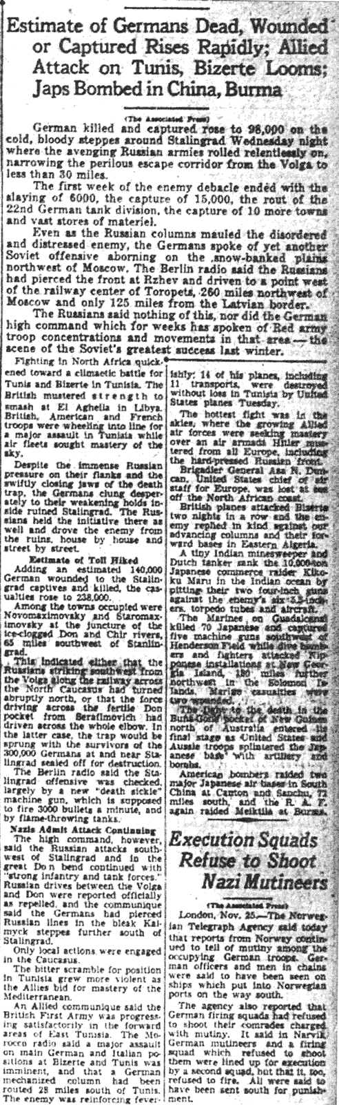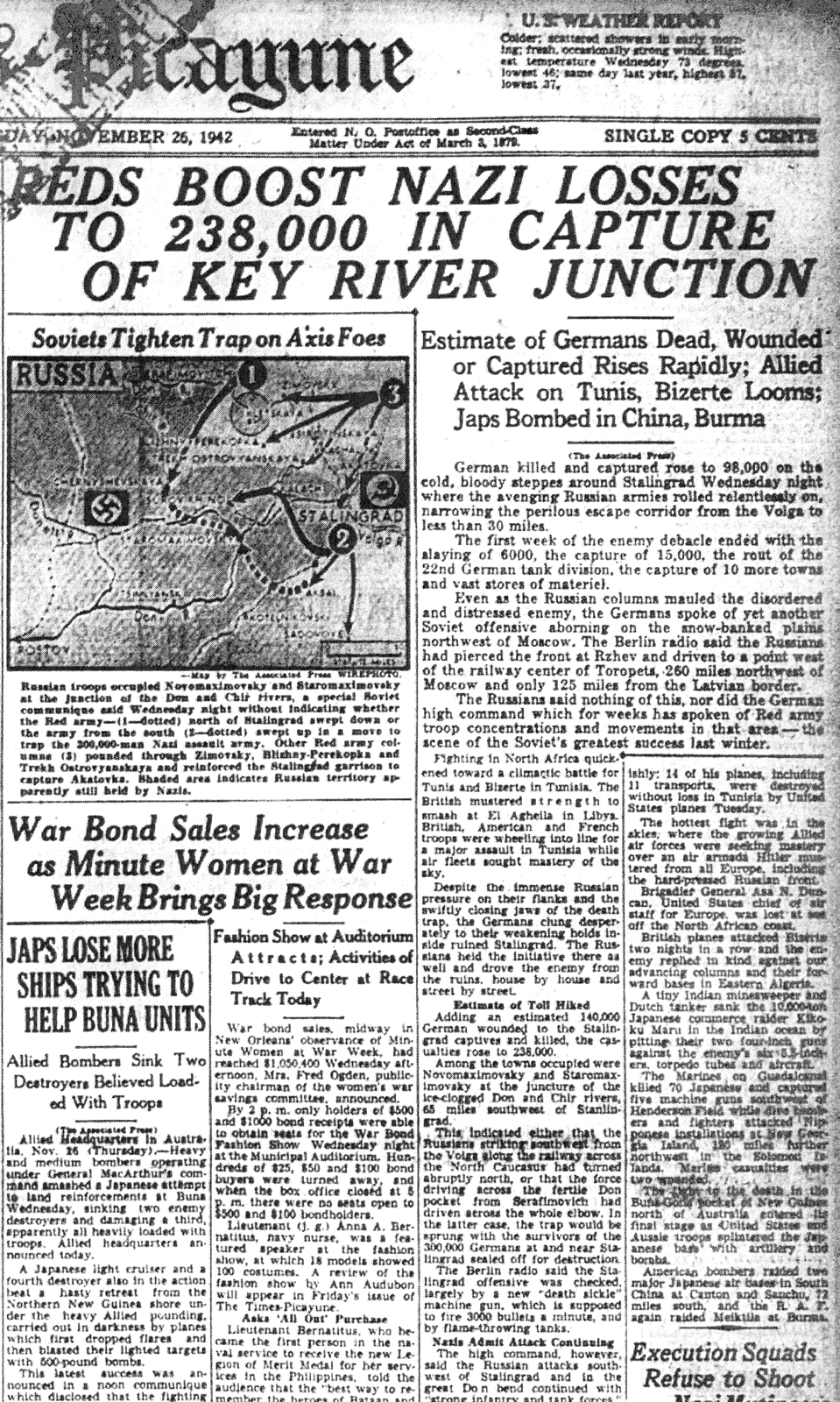 Dr. Wise’s press conference was held during one of the war’s most crucial moments: the ever tightening encirclement of the German 6th Army at Stalingrad. The articles on the front page of The Times-Picayune on November 26, 1942, were all about the fighting outside Stalingrad.