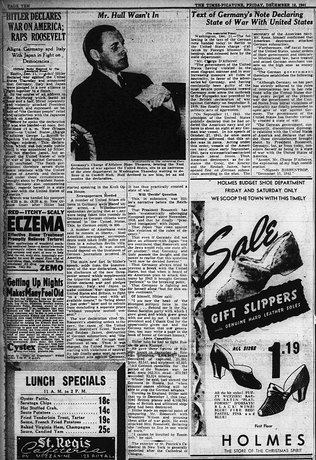 Nazi Germany and Imperial Japan were allies. On December 7, 1941, at the very moment when the German armies were repulsed in front of Moscow and the tide of war changed, Japan attacked the Americans at Pearl Harbor. The following day President Roosevelt stood before Congress and declared war on Japan. Three days later Hitler declared war on the United States. The Times-Picayune published an account of Germany’s declaration of war in its issue of December 12, 1941.